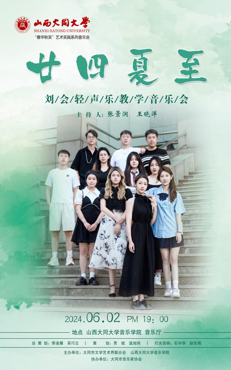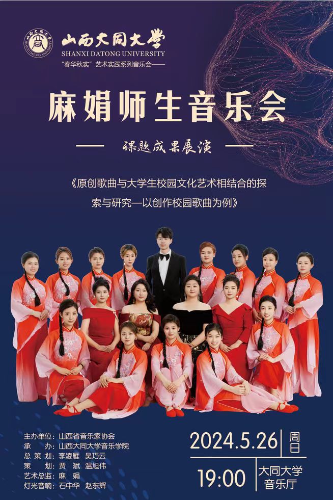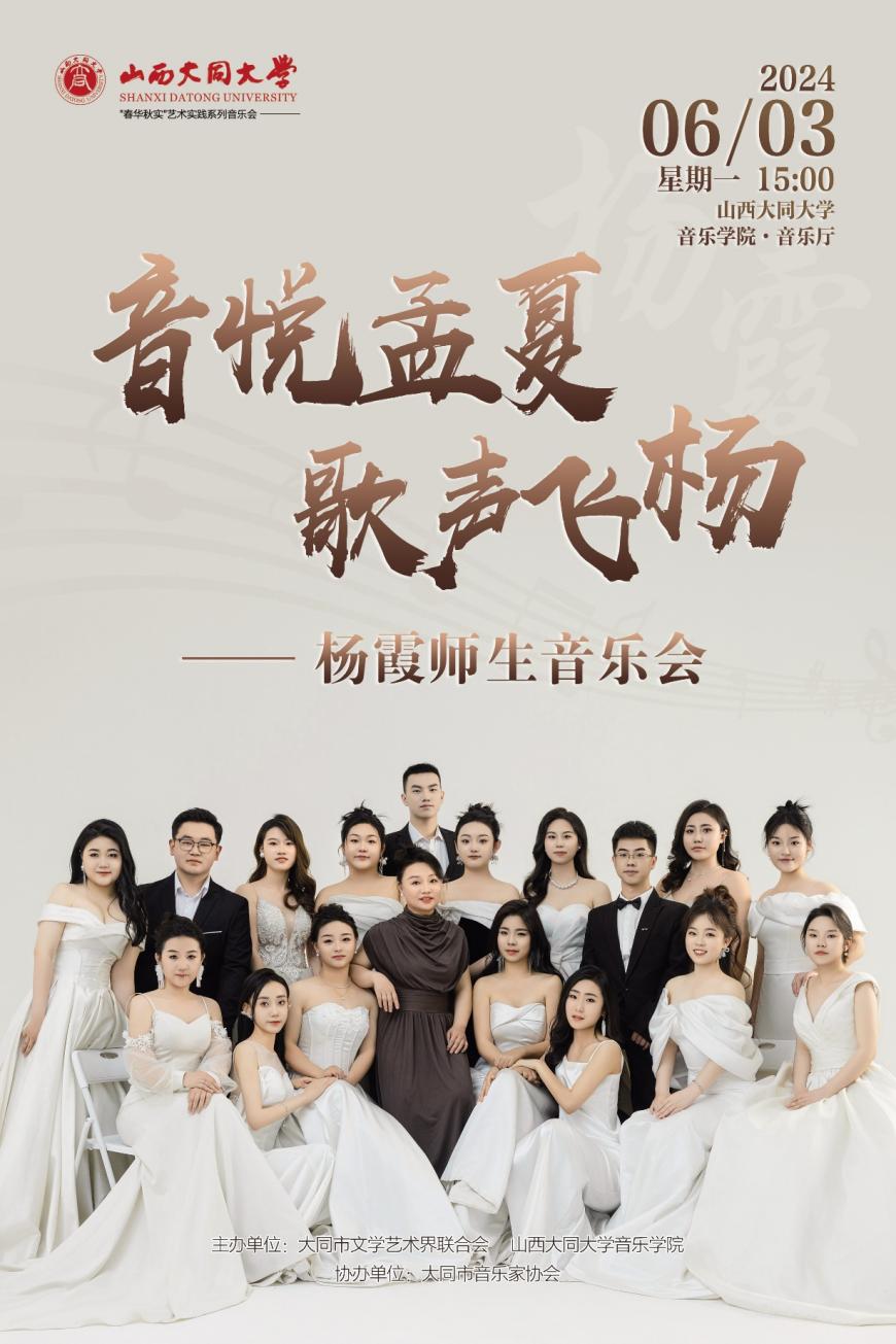 初夏清和,万物并茂,青蓝相继,弦歌不辍。2024年6月3日下午三点于山西大同大学音乐学院音乐厅举办“音悦孟夏,歌声飞杨”——杨霞师生音乐会,山西大同大学音乐学院主办。本场音乐会包括古诗词艺术歌曲,创作歌曲,中外经典咏叹调以及女生小合唱,大合唱等。本场音乐会检验了本人多年来的教学成果,同时也为学生提供了一个展示和实践锻炼的舞台,他们在演唱过程中获得了成就感,增强了自信心,提升了对音乐学习的热情和兴趣,促进了教学相长,达到了举办音乐会的目的;本场音乐会也为观众拓宽了音乐赏析的视野与鉴赏范围,丰富了校园文艺生活。