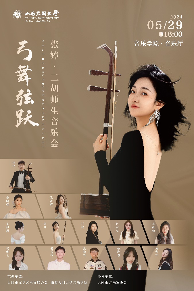 “弓舞弦跃”张婷二胡师生音乐会于2024年5月29日在大同大学音乐厅举办。二胡是重要的中国民族乐器之一,它的音色近乎跟人声一样,具有歌唱性和诉说感。本场音乐会为学生提供了相互交流、相互学习和上台锻炼的机会。音乐会中包含了优秀学生的获奖独奏作品、重奏改编作品、齐奏作品以及张婷老师演奏的《阳光照耀着塔什库尔干》等十首二胡作品,参演二胡学生共13人。演出现场火热,掌声不断。