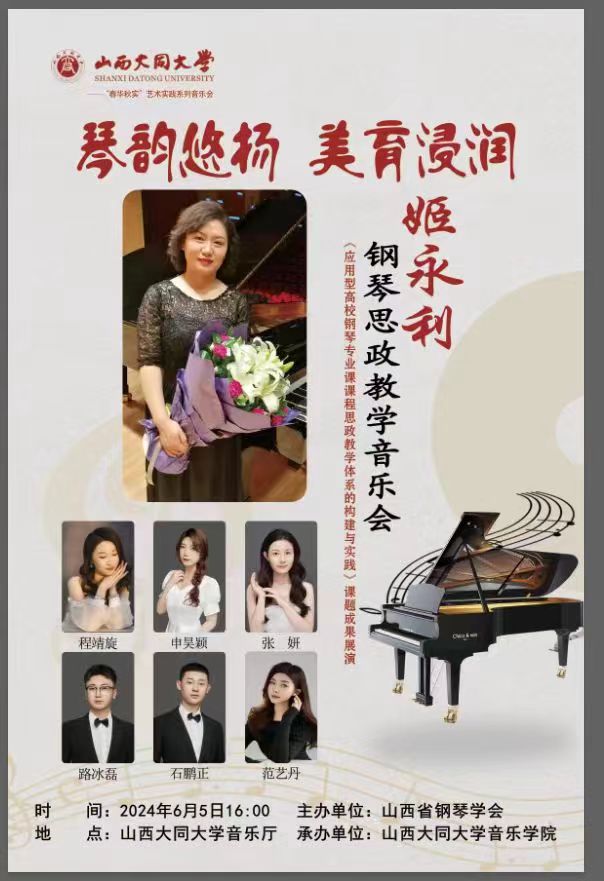 2024年6月5 日下午16:00,在山西大同大学音乐学院音乐厅成功举办了“琴韵悠扬 美育浸润—姬永利钢琴思政教学音乐会”。本次音乐会既是姬永利老师近几年钢琴思政教学的总结与汇报,又是她主持的教改课题《应用型高校钢琴专业课课程思政教学体系的构建与实践》的成果展演。音乐会演奏形式丰富多样,有钢琴独奏、钢琴伴奏、钢琴与器乐合奏、钢琴四手联弹、八手联弹等多种形式,涉及15首中外经典的音乐作品。音乐会不仅展示了同学们娴熟的专业演奏技能,还表现出他们对每首作品蕴藏的思想情感的深入理解和感悟。观众们深刻感受到了音乐的力量,在钢琴艺术的徜徉中,进行了深遂的精神洗礼,增强了文化自信,激发了他们强烈的民族认同感与爱国情怀。