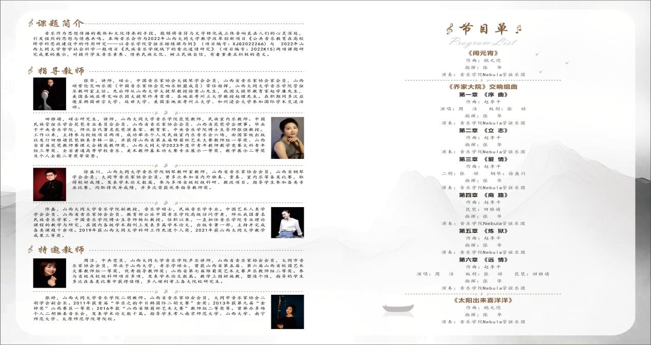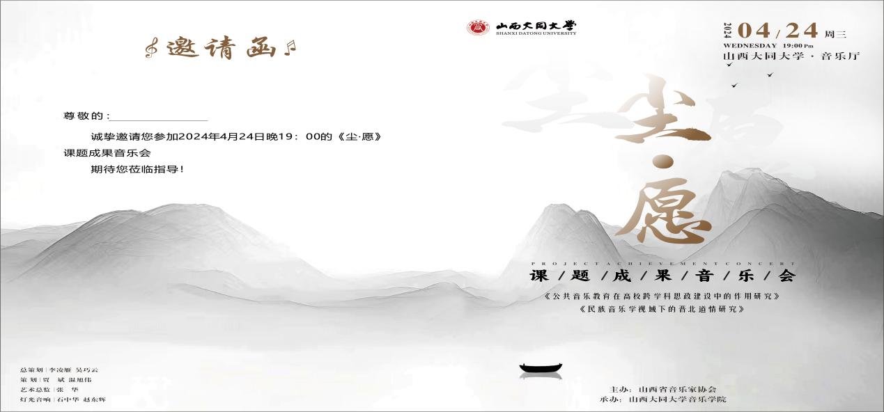 2024年4月24日,在大同大学音乐厅举办了课题成果音乐会。音乐作为思想传播的载体和文化传承的手段,能够将音符与文字转化成立体音响直击人们的心灵深处,引发强烈的思想与情感共鸣。本场音乐会作为2022年山西大同大学教学改革创新项目《公共音乐教育在高校跨学科思政建设中的作用研究——以音乐学院管弦乐排练课为例》(项目编号:XJG2022266)与 2022年山西大同大学哲学社会科学一般项目《民族音乐学视域下的晋北道情研究》(项目编号:2022K15)两项课题研究成果的展示,对提升学生音乐素养、传承民族文化、树立民族自信,有着重要且积极的意义。