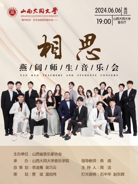 为了提高教师的声乐专业教学水平,锻炼学生的舞台实践能力,特于2024年6月6日晚 7:00在大同大学音乐厅举办“相思——燕阔师生音乐会”,本场音乐会由山西省音乐家协会主办,大同大学音乐学院承办。音乐会共有14个节目,包括独唱、二重唱、合唱等多种演唱形式,燕阔19名在校学生共同参与。音乐会吸引了本校师生以及大同市各界声乐爱好者前来观看,师生表演受到一致好评,通过此次音乐会,积累了演出经验,也发现了教学中存在的问题,为今后的教学改进提供了实践依据。