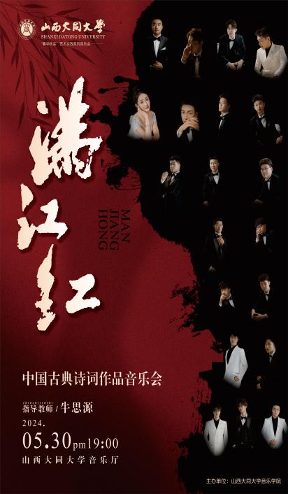 2024年5月30 日,下午19:00在山西大同大学,音乐学院音乐厅成功举办了“满江红”中国古典诗词音乐会(牛思源师生音乐会)。此次音乐会的主旨是弘扬中华优秀传统文化,建立文化自信,以音乐彰显对祖国悠久历史的深厚情感,对民族精神的执着追求,借此音乐会来培养学生舞台实践能力,提高学生学习专业技能。本场音乐会包含的作品有《水调歌头·明月几时有》《满江红》《秦风·无衣》等。本次音乐会让学生在了解优秀的中华传统文化的同时,也树立高远的追求和深厚的家国情怀。