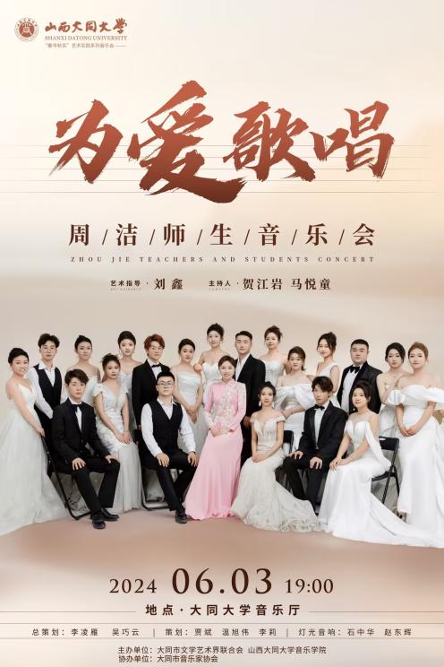 2024年6月3号大同大学音乐厅开展了以“为爱歌唱”为主题的周洁师生音乐会。声乐表演一直是声乐与表演共存,为了让学生多一次提升技术技巧和舞台经验的学习机会,我们每一学年都会组织一场音乐会。本次音乐会我们精心挑选了15个节目进行展演,有独唱,小合唱,重唱,男女二重唱,大合唱五种演唱形式,参演同学共20人。演出过程中,音乐厅的听众络绎不绝,掌声四起,演出结束后,听众都意犹未尽,但我们坚信,灯光会熄灭、 音乐会结束 、掌声会停止 、但生命的乐章永远不会落幕。