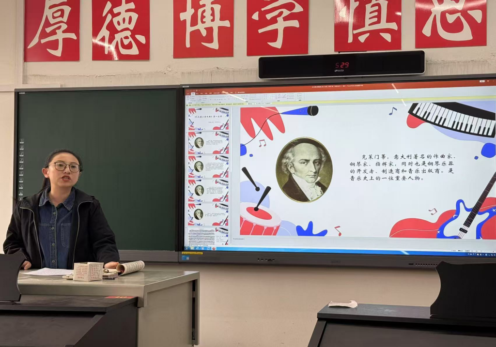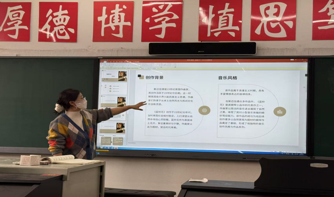 曲怡副教授的案例聚焦于英国民歌《蓝铃花》,教学过程从复习音阶琶音这一基础环节入手,强调了基本弹奏练习对于提升技艺的重要性。整个教学流程涵盖创作背景与音乐风格的介绍、调式与音乐设计的探讨以及弹奏技术与要点的全面分析。尤为值得一提的是,对弹奏技术的讲解极为详尽,从双手分解动作的精准把握到默契配合,再到踏板使用方式的巧妙运用,均逐一进行了深入浅出的介绍。