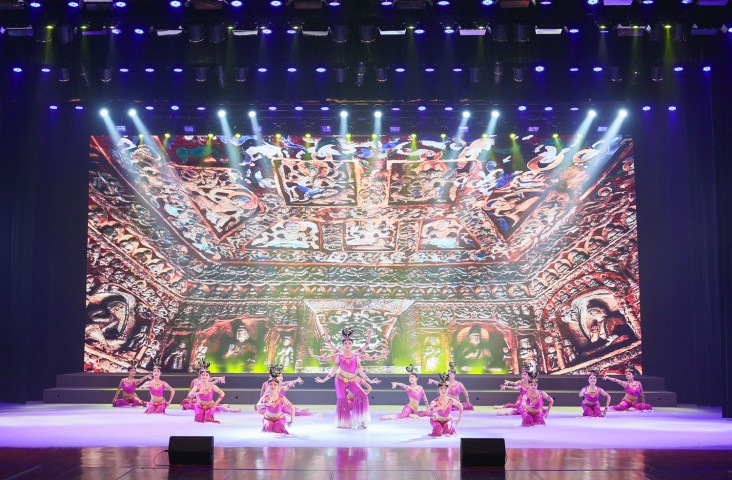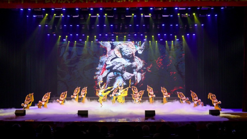 舞蹈《北魏雄风》以英姿飒爽的舞姿再现北魏王朝的雄浑气象;琵琶独奏《云冈妙音》力图唤醒云冈伎乐中的龟兹乐舞文化,再现曾为华夏音乐注入蓬勃生机的北魏之音;取材于云冈第8窟六臂阿修罗像的《六臂神舞》,通过光影与肢体的结合,营造出“破壁而出”的视觉震撼;以云冈第7窟六位供养天人为原型的《六黛风华》,则以“极简古朴”的身体语言,诠释梁思成先生盛赞的“云冈六美人”造像之美;由埙、筝演奏与独唱组成的节目《关山月》,唯美呈现了云冈伎乐中的汉族音乐文化;《束腰鼓舞》翩然而入,宛若云冈石窟造像雕刻中的伎乐飞天身系宽边细腰鼓,时而翻转、时而跳跃,营造出满壁风动的艺术效果。结尾处,舞蹈《团莲盛景》以云冈石窟大团莲与飞天群为素材,寓意中华民族“交融互鉴、美美与共”的盛世愿景,为展演画上圆满句号。