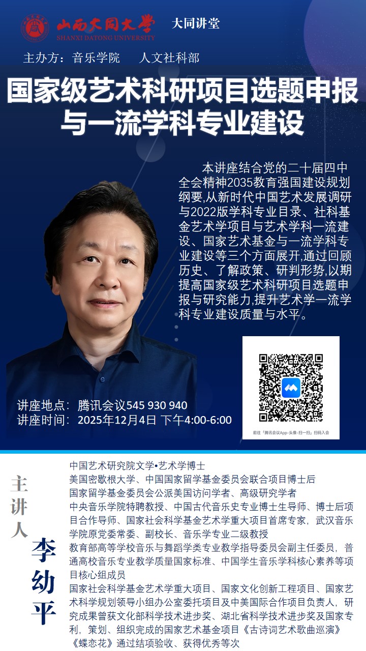 为切实提高教师的科研素养与科研能力,构建一支高层次的科研团队。12月4日下午,音乐学院特邀武汉音乐学院李幼平教授,于207会议室举办了一场线上专题讲座。此次讲座聚焦“国家级艺术科研项目选题申报与一流学科专业建设”主题,为学院全体教师提供专业性指导。